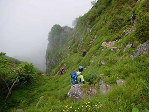 | 数年前に阿弥陀岳に登った時に山頂にいた登山者が南稜を登って来た、と話していて、それ程難しくはなかった、と言っていました。その話を聞いて私もいつかは南稜を登って見たいと思っていました。南稜と言えば冬期のコースだとばかり思っていましたが、夏でも登る事が出来るのか、と感心したのでした。 今回、例会山行としてに計画されたので早速参加申し込みをしました。 立場岳にいた男女ペアの登山者もそこでハーネスを付けて登って行きましたし、P3に近づくと霧で見えませんがザイルパートナーとの掛け声が聞こえていて、人気のコースなのだな、と感心しました。 P3ルンゼも大キレットや西穂〜奥穂と比べれば特に問題なく登る事ができました。 曇りで展望を楽しむ事は出来ませんでしたが、暑さを凌ぐ事が出来てそれなりに良かったと思いました。 参加者の皆さんも元気に歩き通す事が出来、今後も一層のレベルアップを期待します。 |