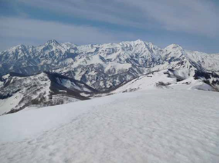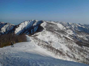 | 妙高市の市街地から西側に見える大毛無山の標高は1429メートル。冬の大毛無山の山頂は、まるで真っ白な鉢をかぶせたようです。「けなしやま」と呼ばれるのも、冬になると山頂では、約10メートルもの雪が積もり、木々がすっぽりと隠れてしまうからです。山頂付近では5月まで春スキーが楽しめます。 妙高市の大毛無山に残雪を踏んで登りました。妙高市新井西野谷から万内川の文化財砂防堰堤1号駐車場からスタートしました。流浜谷の手前の尾根に取付き、急な尾根を登って行きます。雪は深く、2m以上残っています。急斜面も雪にアイゼンを蹴り込んで登って行きます。 林道南葉山線に出ると緩やかになりましたが道に溜まった雪は急な斜面となり、危険なトラバースを強いられます。樹林帯の中を登ると粟立山直下の稜線に出ました。そこをテント場にしました。南には稜線が続いていて大毛無山が見えています。北側は粟立山です。眼下には妙高市、頚城平野も見えていました。その先には関田山脈の鍋倉山が見え、志賀高原、苗場山方面も見えていました。 翌日の朝、大毛無山へ登ります。最初のピークに上がると目の前に妙高山、火打山、焼山が良く見えました。西側には鉾ヶ岳と日本海も見えていました。更に次のピークに上がり、三角点まで行きました。北側には粟立山、難波山が見え、米山、刈羽黒姫山が霞の中に見えていました。関田山脈の鍋倉山、斑尾山も見え、志賀高原の岩菅山、横手山も見えていました。 テント場に戻り、テントを撤収して下山します。林道までブナ林の中をトラバースして下ります。林道から流浜谷の手前の尾根を下ります。急な斜面も何とか下り戻る事が出来ました。 |
