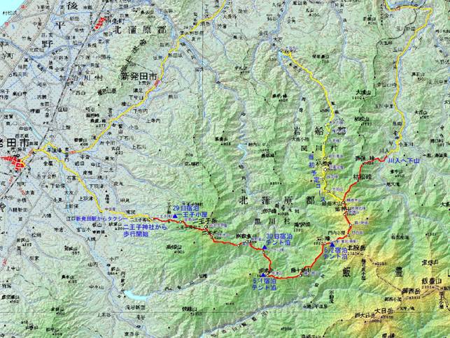 二王子岳から赤津山、飯豊連峰縦走コース図