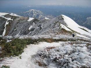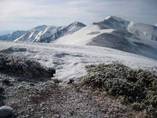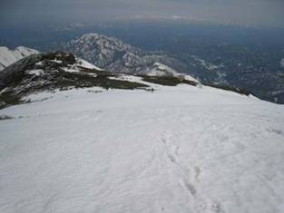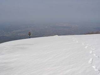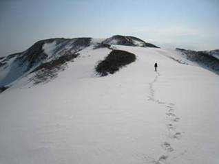 す。雪は凍っていますのでアイゼンを着けて歩き出しました。やっと目で稜線を選んで歩