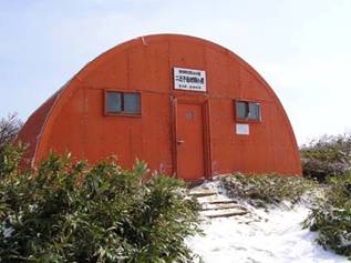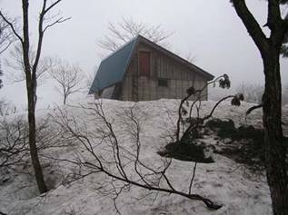 雪の斜面の傾斜が緩くなり平地になると遠くに小屋が見えて来ました。一王子小屋でした