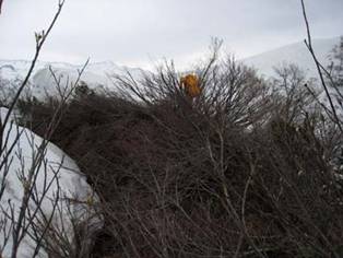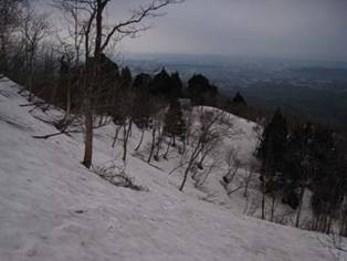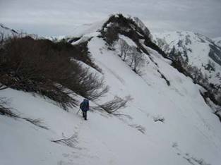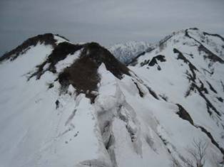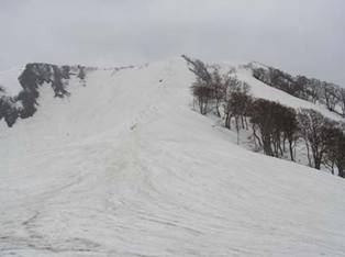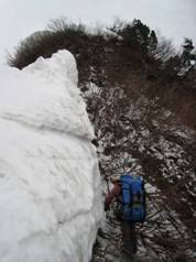 います。途中には大きな雪庇が見えています。黒く見える薮もあります。簡単には通して