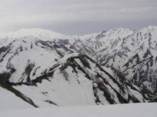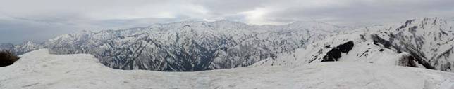 子山、大日岳への稜線がまだ真っ白く見えています。北股岳から北側にはかすかに大朝日