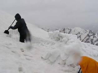 ちた雪で埋まっています。そこをトラバースして通過するには大変危険な状態でした。気