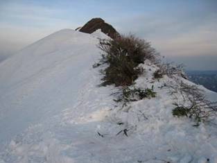 右側に張り出している雪庇の上を歩いて登ります。山頂手前から夏道を上がると頂上に付