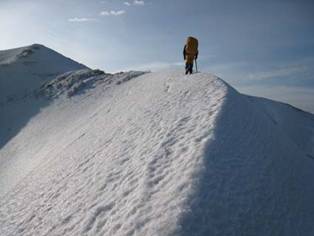 ました。くっきりと澄んだ青空と輝く太陽の下、眩しい白銀の尾根をゆっくりと上がって