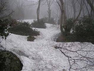 た。一合目と書かれた大きな杉の木で休憩して更に上に上がると道は雪で覆われてきて雪