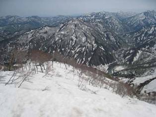 した。二王子岳から赤津山への稜線は標高も低く、残雪が少ないと薮に覆われて歩きにく