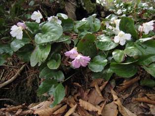 二王子神社から杉林の中を上がる イワウチワが咲いていました
