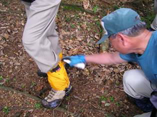 ヒルは近付く動物の歩く振動を感じて落ち葉の下から這い上がって待ち構えています。 石尊山表参道と裏参道分岐を表参道に向かいます。古い石の階段は磨り減っていて斜面と見分けが付きません。 |