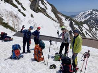 去年の針ノ木は雨でしたが、今回は快晴過ぎて照り返しのおかげですごい日焼けになってしまいました。耳を焼いてしまい、大変です。今シーズンはアイゼンを全然使わなかったので、一から指導してもらってなんとか無事に行って来ました。相変わらず歩きが遅いので、皆さんの足を引っ張りながら、テレビでみるような雪の壁と真っ青な空を味わいました。 |